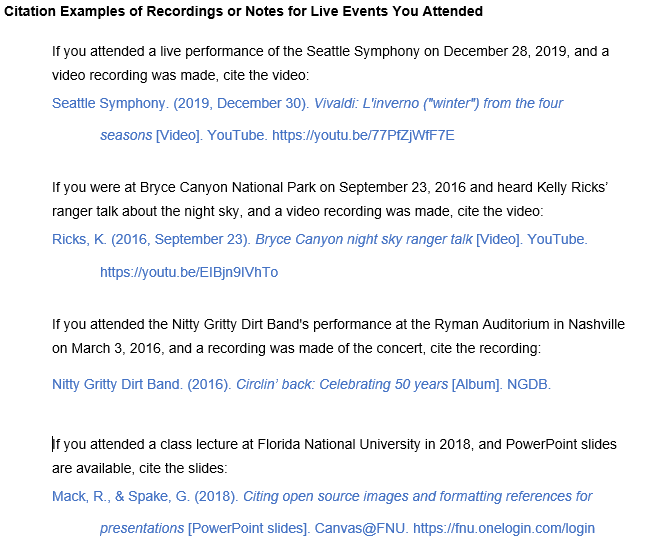 Citations need to be retrievable, meaning whoever reads your paper needs to be able to find the same sources that you used. Therefore, live performances, talks, or events must be cited in your paper instead of in your reference list. Cite them as a personal communication as explained below. However, if a live performance that you attended was recorded and is retrievable, cite the recording using the Video Recording or Audio Recording template. Or, if a lecture that you attended was not recorded but slides or lecture notes are retrievable online, cite the slides or notes using the Other Visual Works option on the Artwork template.